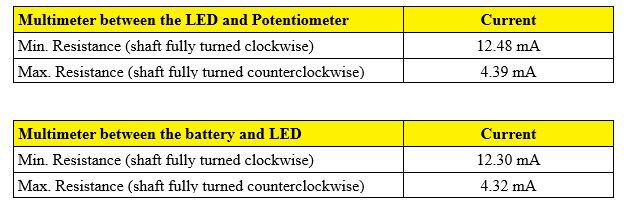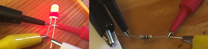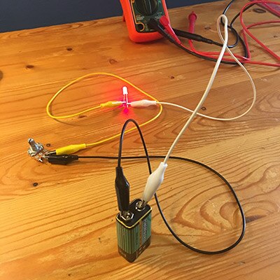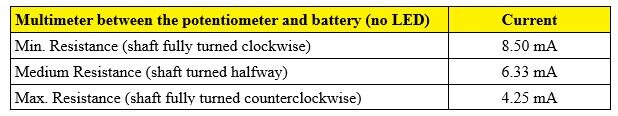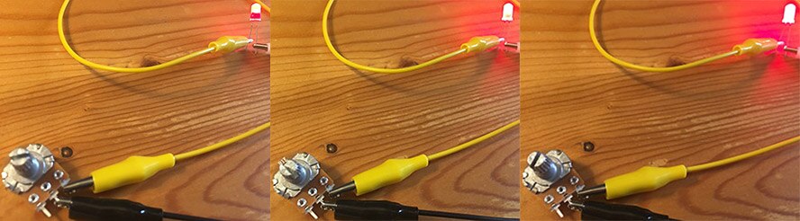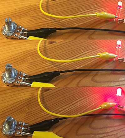 Still, it was fun to play with the potentiometer, turning the knob and watching the LED’s brightness change as less and more current goes through it. A potentiometer isn’t polar so the LED would light up no matter which test lead was connected to the potentiometer’s terminals.