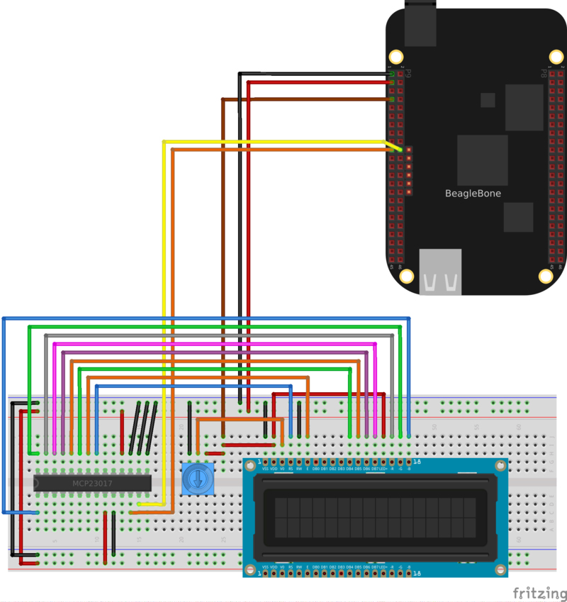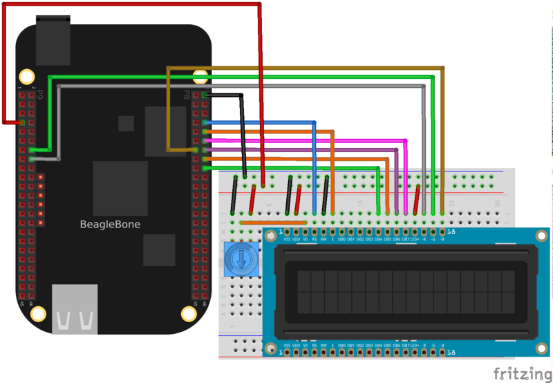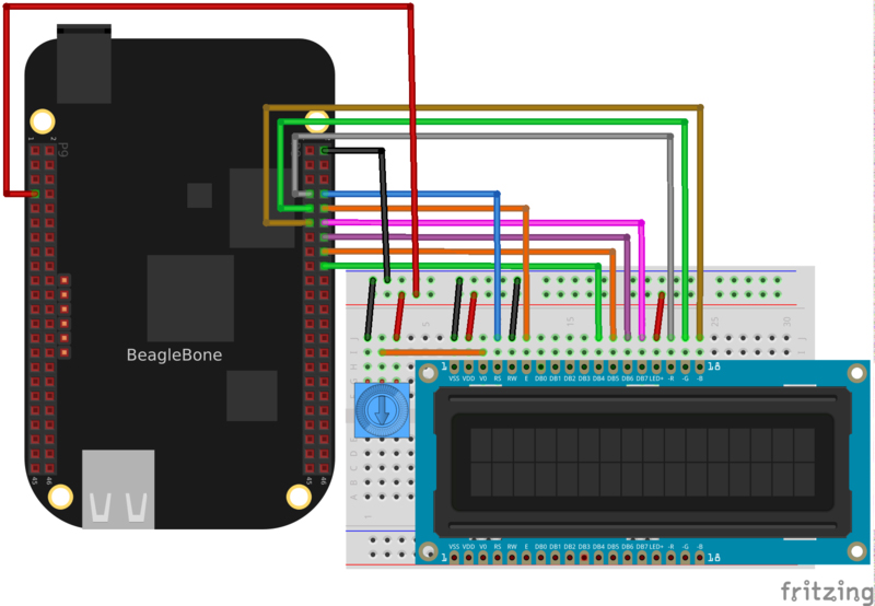 • Connect BeagleBone Black pin P8_18 to LCD pin 11 (DB4).