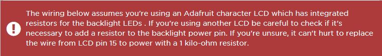 If you aren't familiar with the character LCD plate, make sure to first read the guide on its usage.