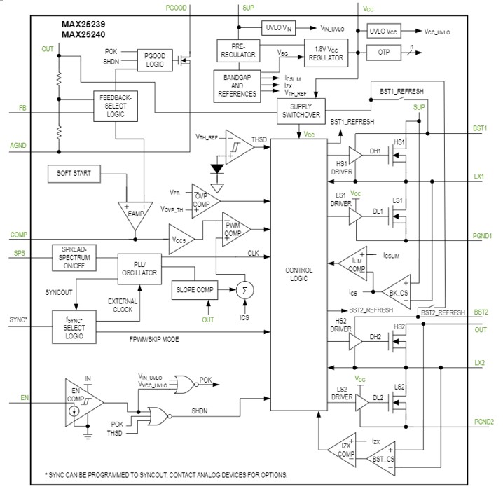 The MAX25239 and MAX25240 have three switching frequency options: 2.1 MHz, 400 kHz, and 200 kHz. The 2.1 MHz high switching frequency allows small external components and reduced output ripple and guarantees no AM band interference; the 400 kHz and 200 kHz switching frequencies offer better efficiency and relieve power consumption concerns. The SYNC input allows three operation modes: skip mode with ultra-low quiescent current, forced fixed-frequency PWM operation, and synchronization to an external clock. The IC also includes spread-spectrum frequency modulation to minimize electromagnetic interference (EMI).