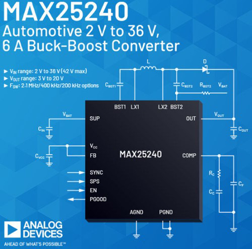 Analog Devices' MAX25239 and MAX25240 are automotive 2 V to 36 V, 4 A and 6 A buck-boost converters