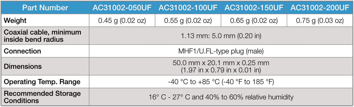 The flexibility and peel-and-stick adhesive backing make the AC31002 antenna easy to mount in unique and custom enclosures. Connection is made to the radio via a 1.13 mm coaxial cable terminated in a U.FL-type plug connector. Various cable length options are available (see ordering information).