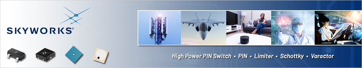 Building on a proven legacy, our diode product offering includes PIN, Schottky, varactor and limiter diodes for a wide variety of microwave applications including WLAN, infrastructure-5G, handset, SatCom (LNB/DBS-CATV), automotive, military, test & measurement, metering, medical, RFID and IoT. Our discrete silicon and GaAs semiconductors are available as die, plastic packaged, surface mount (SMT), and ceramic hermetic packaged devices. Frequency ranges include low frequency, HF, VHF, UHF, L band, S band, C band, X band, KU band, K band, and Ka band. Skyworks diode products are manufactured using the most advanced processes and leadership technology.